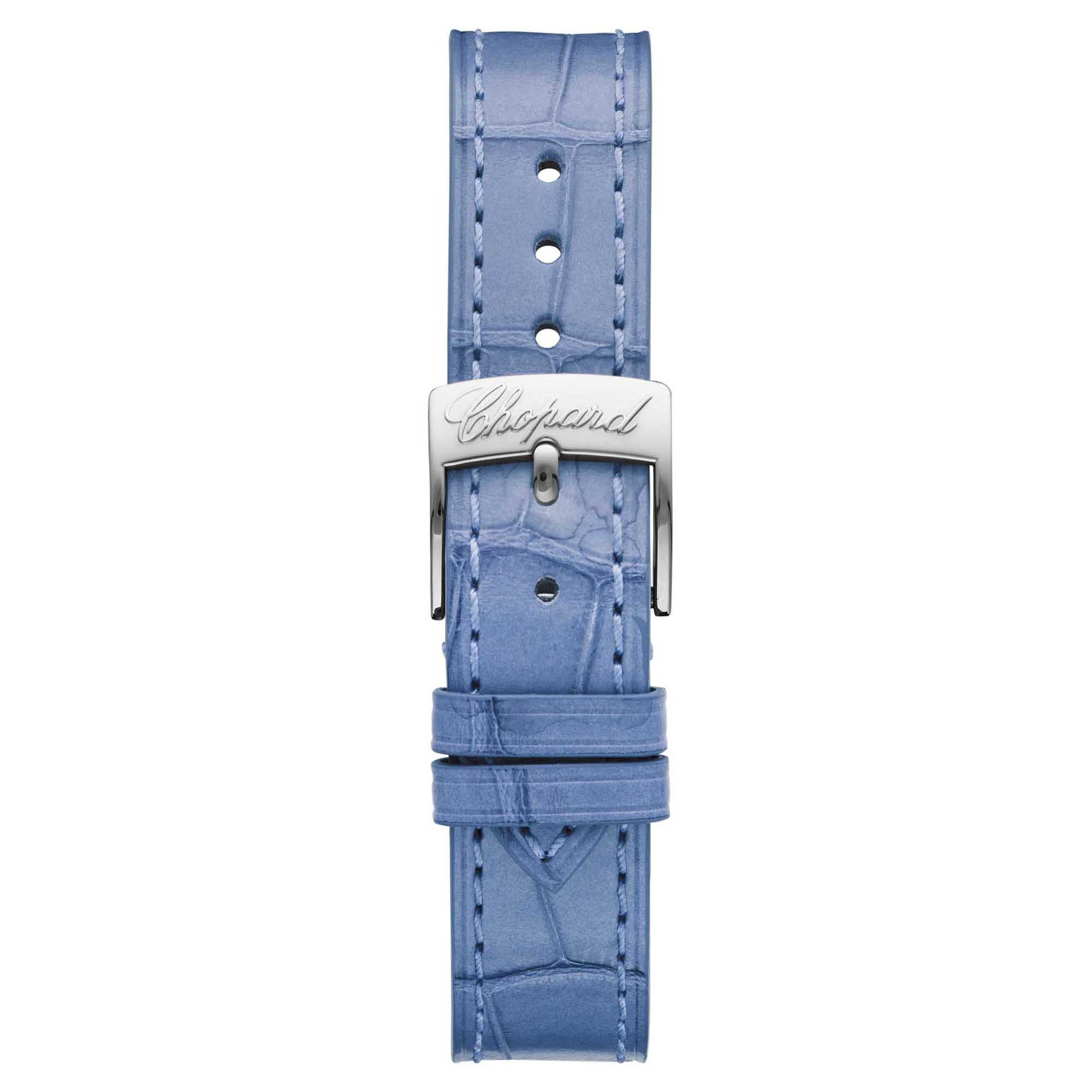 Ref. 278573-3010 - Chic und feminin - die Happy Sport Uhr aus Edelstahl hat ein neues im Haus gefertigtes Automatikwerk, das in der Chopard Manufaktur entwickelt wurde, um das 25-jährige Jubiläum der Happy Sport zu feiern. Das Edelstahlgehäuse, das perfekt die Philosophie von Chopard widerspiegelt, umschließt das seidig schimmernde fein strukturierte Perlmuttzifferblatt in Hellblau. Das Lederarmband ist farblich passend dazu.