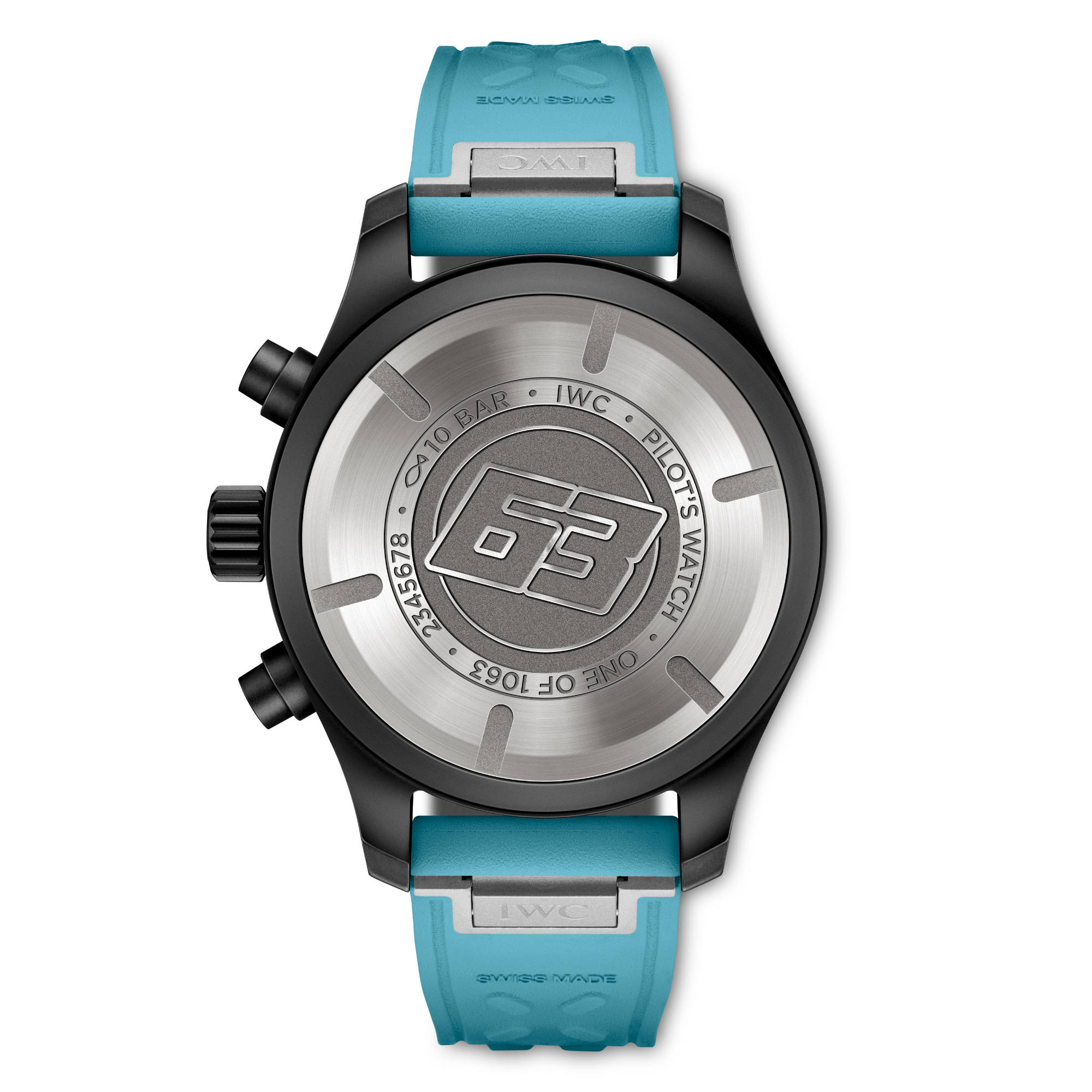Die Krone und die Drücker bestehen aus Ceratanium®, einem von IWC entwickelten Material, das die Leichtigkeit von Titan mit einer Härte und Kratzfestigkeit ähnlich der von Keramik verbindet. Das schwarze Zifferblatt ist mit Indizes und Ziffern in George Russells charakteristischem Blauton bedruckt. Die schwarzen Zeiger sind mit Super-LumiNova® in der gleichen Farbe ausgefüllt.