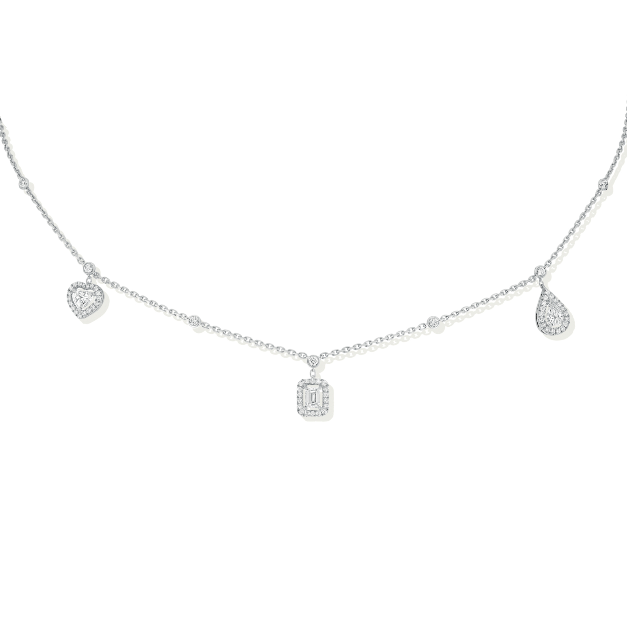 Ein Diamant im Herzschliff, ein Diamant im Smaragdschliff und ein Diamant im Tropfenschliff – drei ewige Steine, die von Diamanten im Brillantschliff umgeben sind und hervorgehoben werden. Der äußerst symbolische Damenschmuck verführt mit einem eleganten und zeitlosen Stil, der sich für jeden Anlass eignet.