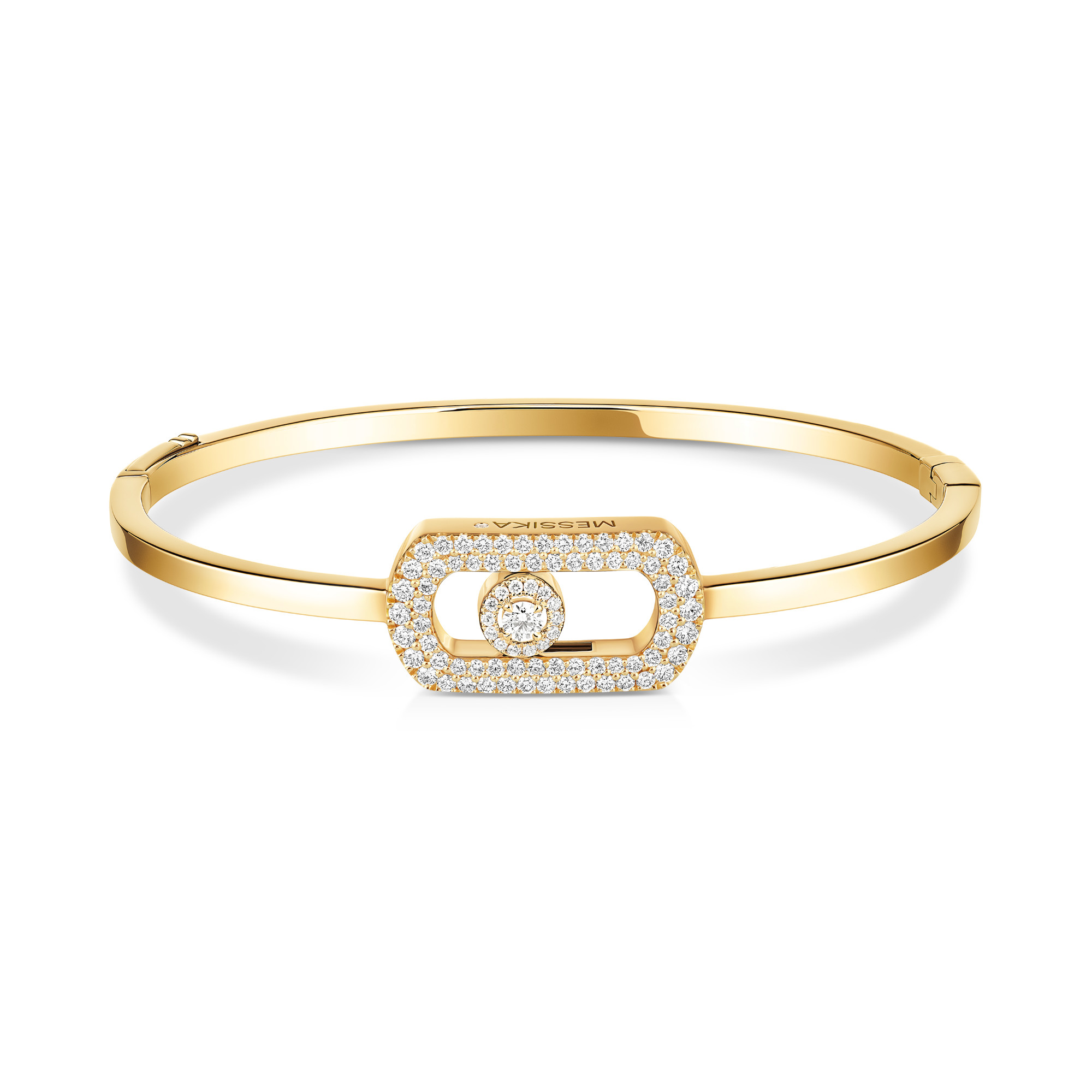 Ref. 13428-YG - Der Damenarmreif in einer Neuinterpretation von Messika. Der mit Diamanten ausgefasste So Move Diamantarmreif aus Gelbgold mit ist ein Oversize-Schmuckstück, das eine unwiderstehliche Anziehungskraft ausübt und das Handgelenk mit einer nie dagewesenen Kraft und Ausstrahlung schmückt. Ein Diamantschmuckstück mit Charakter, das einzeln oder in Kombination getragen werden kann. Dieser XXL-Luxusarmreif verleiht jedem Stil sofort eine ultramodische Note. Das Move-Motiv in Übergröße gewinnt an Substanz und Präsenz und wird zu einem Symbol der Selbstbehauptung, mit dem Sie sich trauen und sich von den Codes befreien können. Diese Version mit Diamantbesatz ist noch kühner und strahlt voller Licht und verstärkt den Glanz des beweglichen zentralen Steins und seines unverwechselbaren Halos, der mit Diamanten ausgefasst ist.