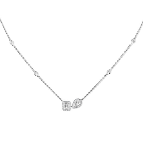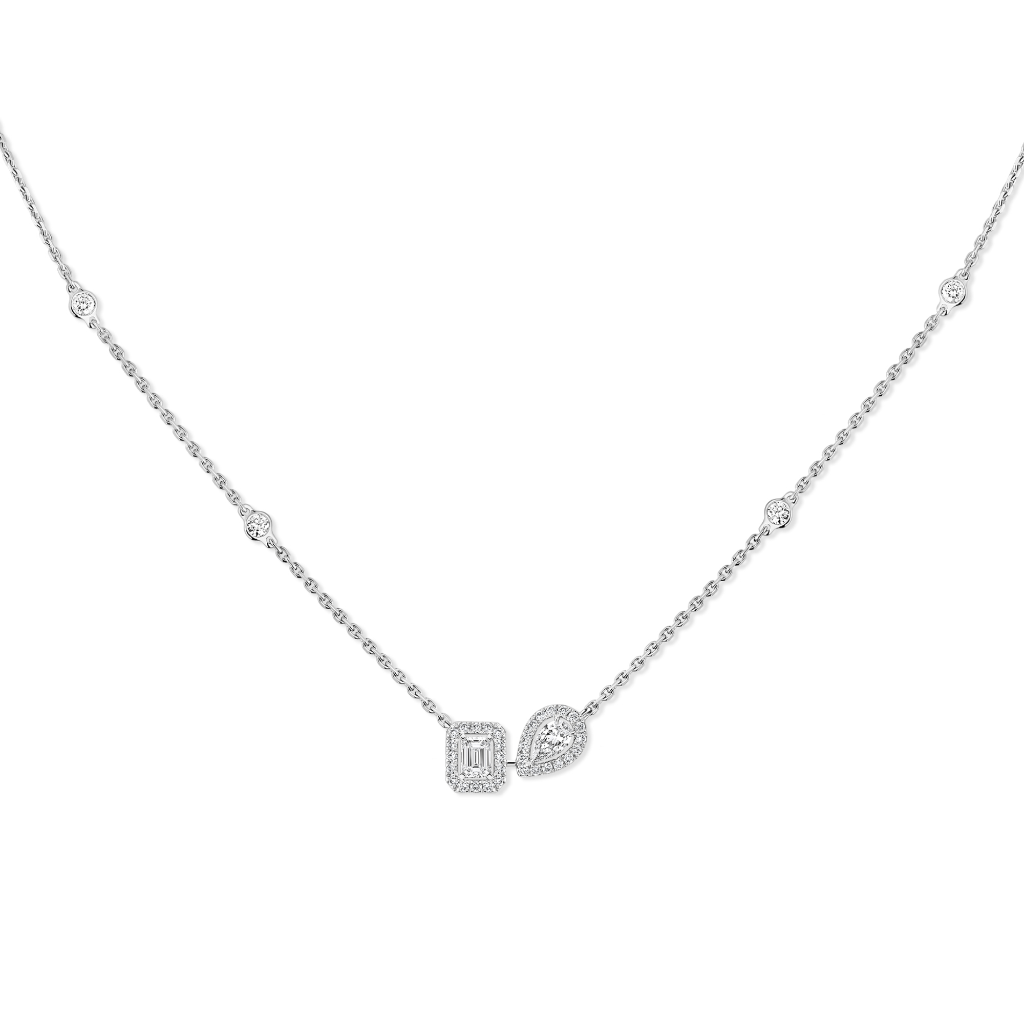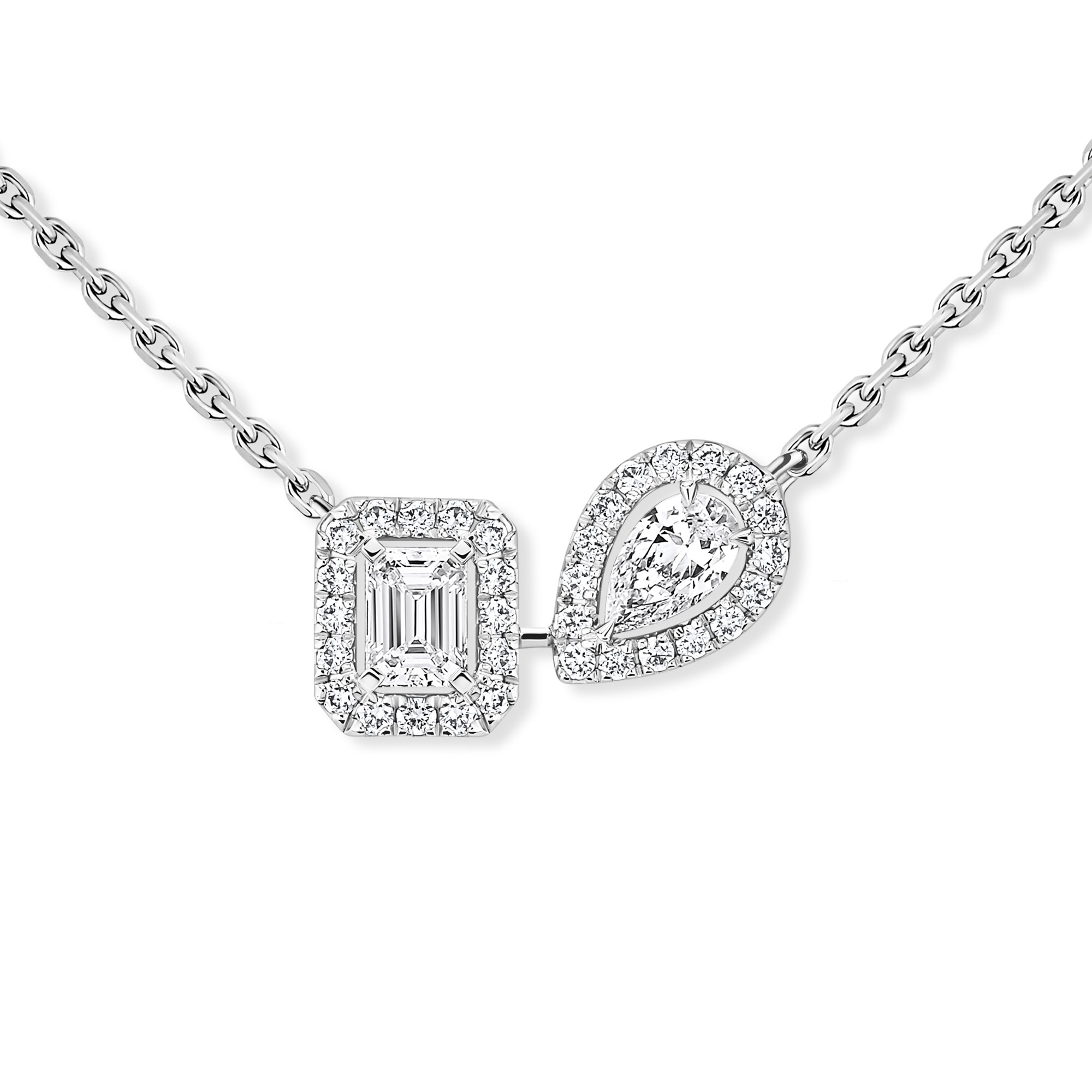 Ref. 14534-WG - My Twin zelebriert die Harmonie von Gegensätzen: die Grafik des Diamanten im Smaragdschliff und die Sinnlichkeit des Diamanten im Tropfenschliff. Ein außergewöhnliches Duo, das durch diese Diamantkette aus Weißgold veredelt wird. Die mit Diamanten ausgefasste, subtil durchbrochene Umrandung ist der unverkennbare Code der Maison und verstärkt den Glanz der zentralen Steine. Die Neigung des tropfenförmigen Diamanten verleiht dem Schmuckstück einen modernen Akzent. Diese Diamantkette für Damen ist leicht zu tragen und begleitet Sie auf Schritt und Tritt. Kombinieren Sie es mit anderen luxuriösen Schmuckstücken der Maison, um einen noch stärkeren Eindruck zu hinterlassen.