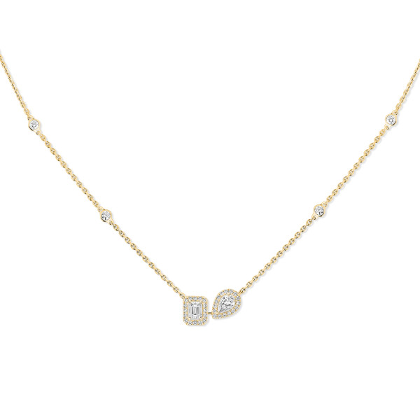 Ref. 14534-YG - Zwei Steine, zwei Charaktere, eine Vision: die einer selbstbewussten Dualität. Die My Twin Halskette aus Gelbgold und Diamanten zelebriert durch das Zusammentreffen von Diamanten im Smaragdschliff und Diamanten im Tropfenschliff jede Facette Ihrer Persönlichkeit. Der Signatur-Code der Maison, die subtil durchbrochene, mit Diamanten ausgefasste Umrandung, hebt die Volumen der zentralen Steine hervor und lässt das Licht um die Diamanten spielen. Die Neigung des Diamanten im Tropfenschliff ist eine kreative Kühnheit, die dem Schmuckstück einen schönen zeitgenössischen Akzent verleiht. Diese Halskette aus Gold und Diamanten kann einzeln oder in Kombination mit anderen Messika Kreationen getragen werden und wird Sie in Ihren intimsten und glanzvollsten Momenten begleiten.