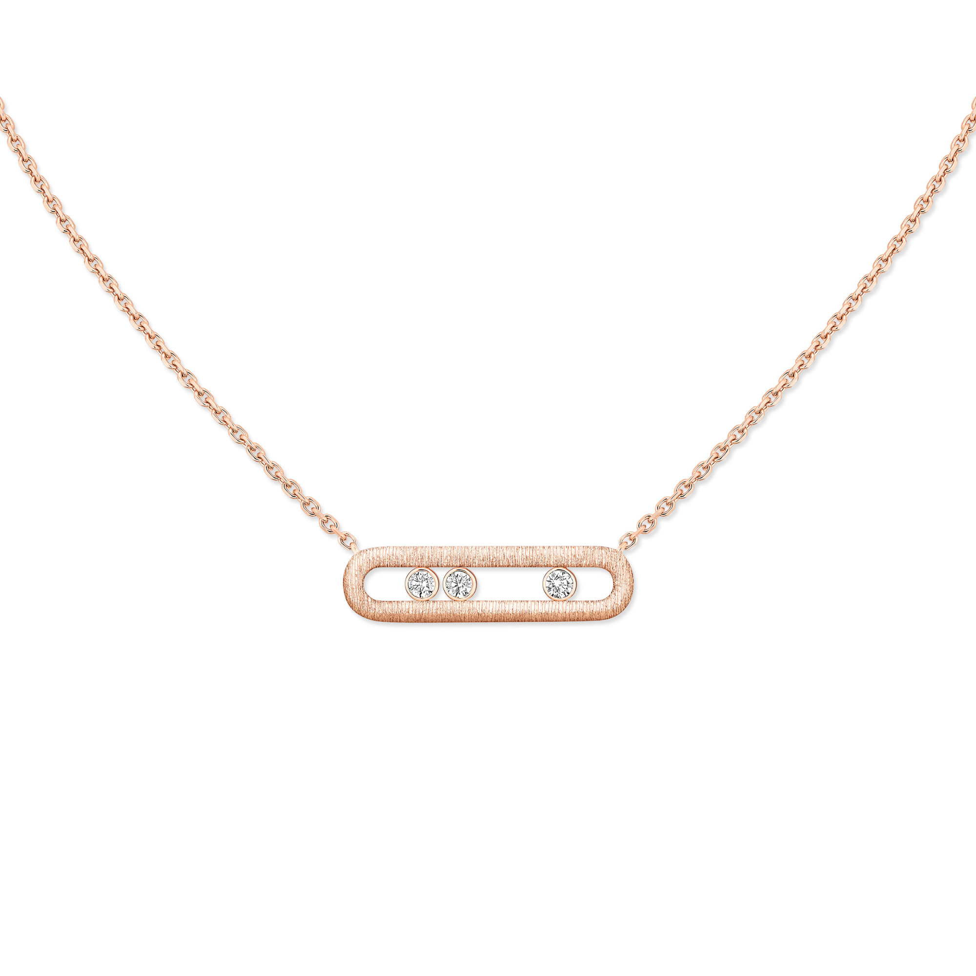 Ref. 14667-PG - Die Maison Messika enthüllt eine ziselierte Roségoldversion ihrer legendären Move Diamantkette aus Gold. Die Präzision der Juwelierhandschrift, die markante Materialarbeit und das Spiel mit kontrastierenden Reliefs des ziselierten Goldes verleihen den einzigartigen Luxusschmuckstücken eine subtile Vintage-Aura. Diese einzigartige, vollständig von Hand gefertigte Oberfläche fängt das Licht ein und reflektiert es in einem virtuosen Dialog zwischen dem kräftigen Roségold und den beweglichen Diamanten unendlich oft.