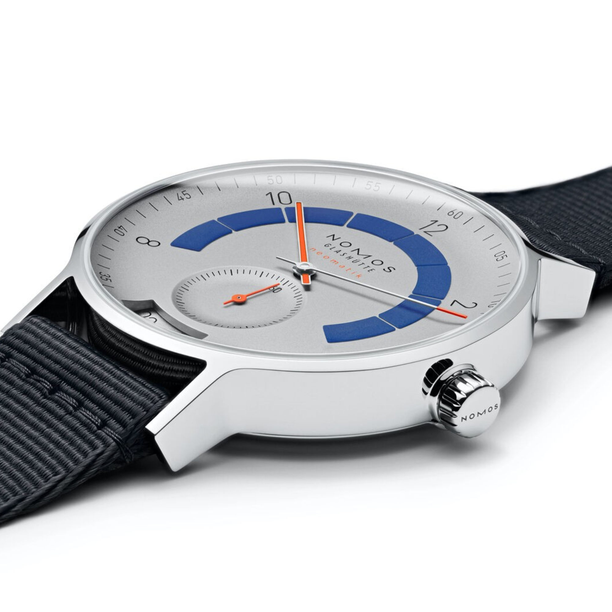 Ref. 1303 - Rasant: die Rennversion unter den drei Autobahn-Modellen, mit Blau auf grauem Rund und neonorangenen Zeigern. Eine selbstbewusste, deutliche Uhr. Mit feiner Lünette, auffälliger Krone, markantem Blatt.