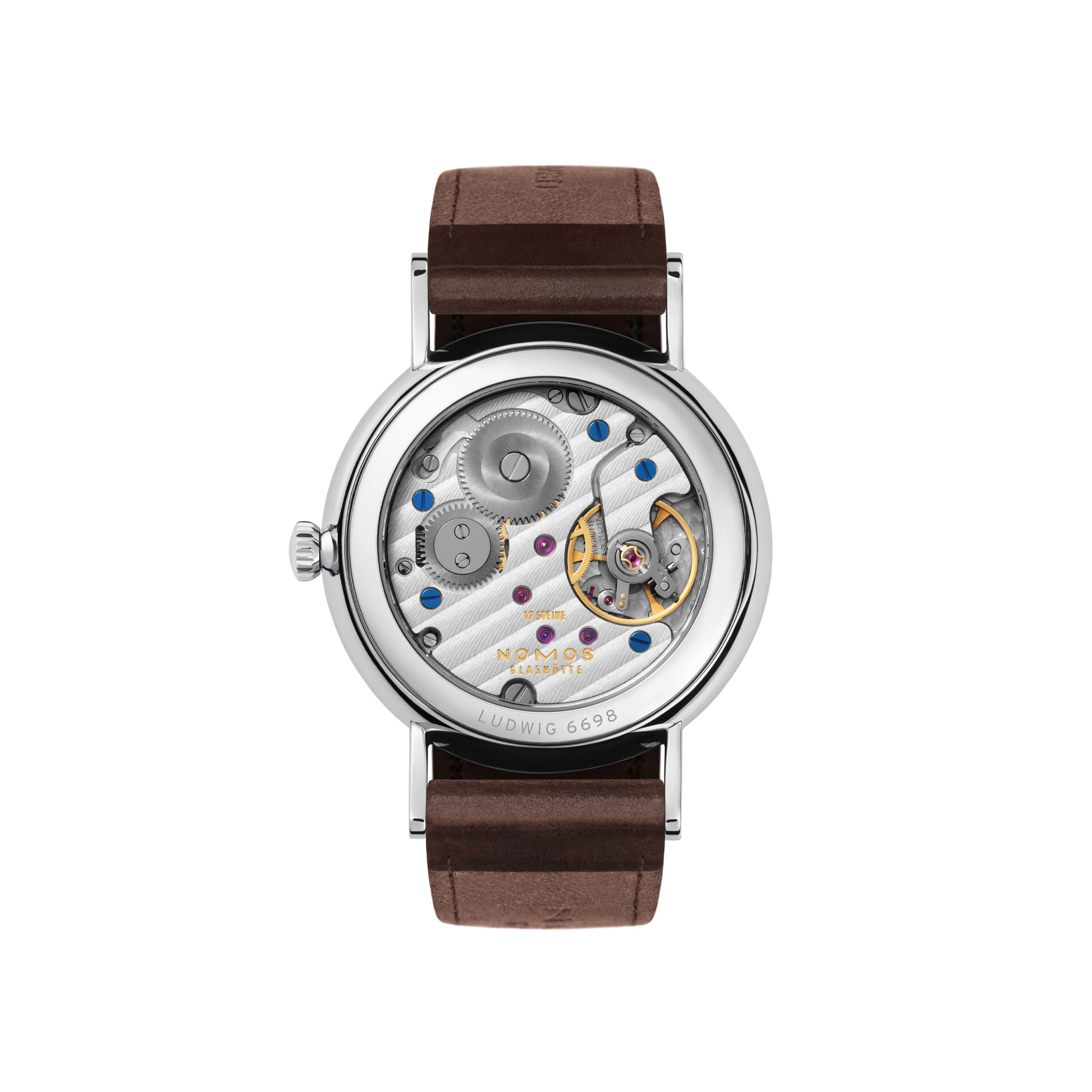 temperaturgebläute Schrauben, rhodinierte Werkoberflächen mit Glashütter Streifenschliff und NOMOS-Perlage, Sperr- und Konrad mit Glashütter Sonnenschliff