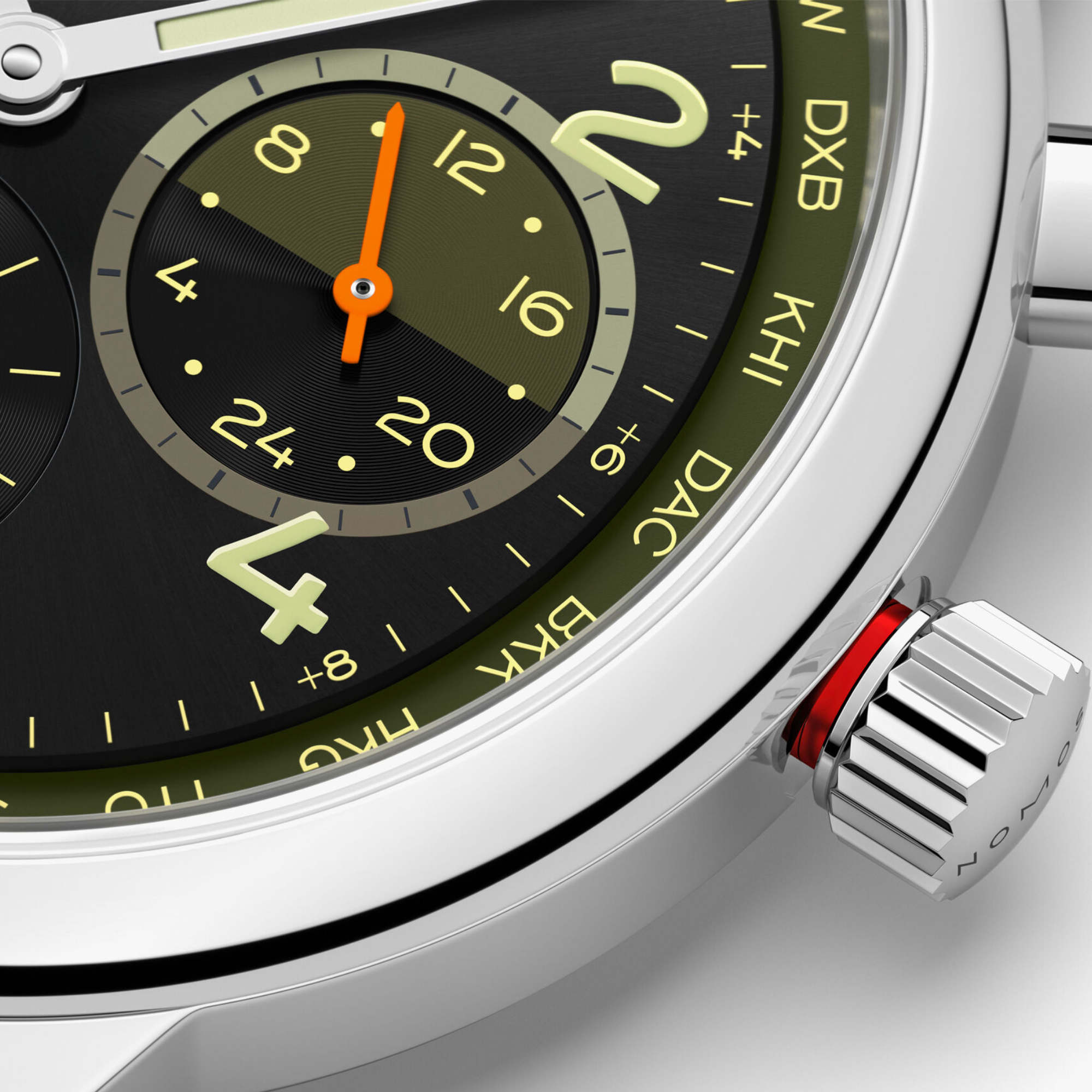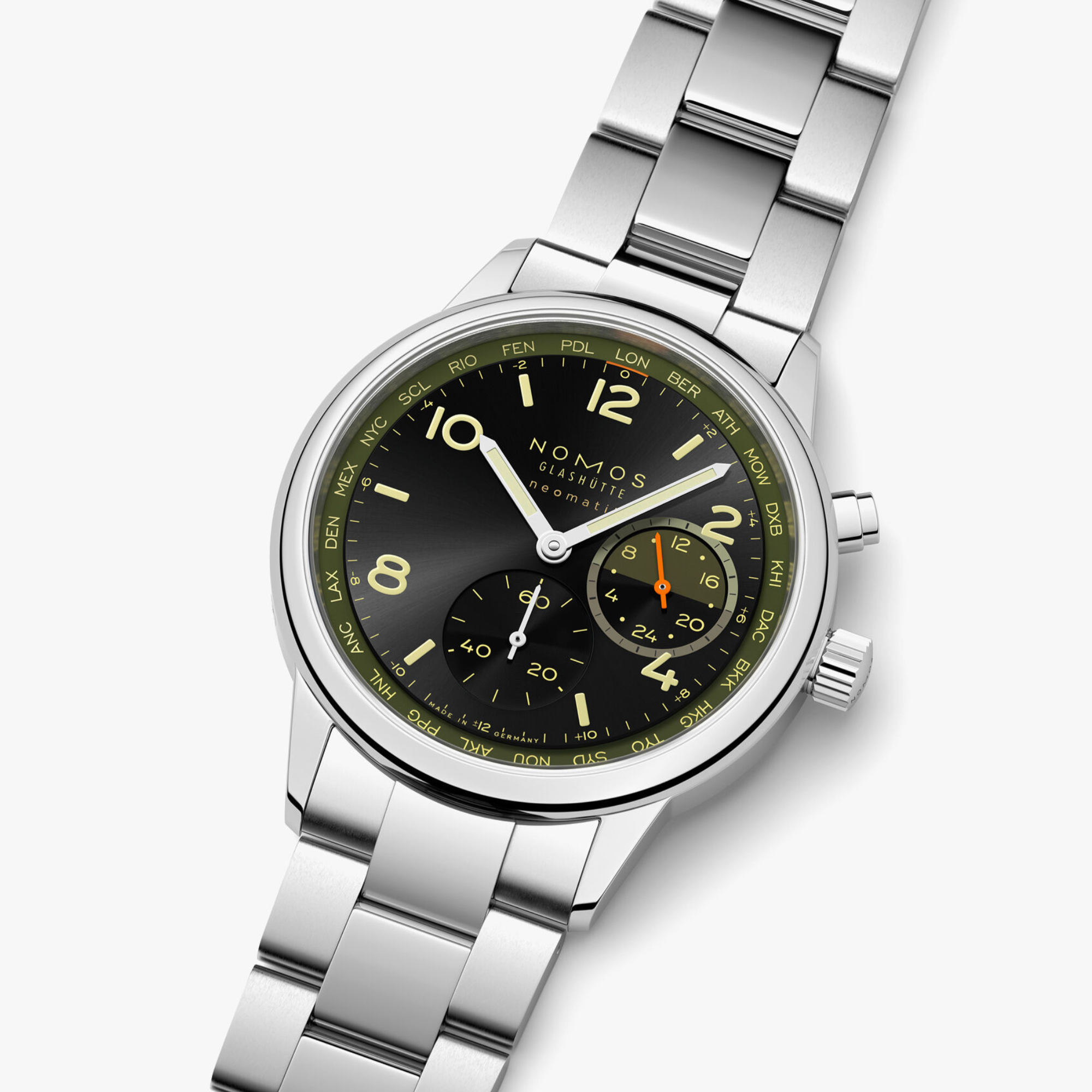 Ref. 790.S9 - Die Night-Navigation-Serie des NOMOS Worldtimers ist der nächtlichen Urbanität rund um den Globus gewidmet. Vector, mit einem Zifferblatt in Schwarz, Oliv und helleren Akzenten, erinnert an die richtungsweisenden Instrumente in einem Cockpit oder Hinweisschilder in einer fremden Stadt. Die Weltzeituhr zeigt 24 Zeitzonen auf einen Blick und verfügt über eine 24-Stunden-Anzeige mit Tag- und Nacht-Display für die Heimatzeit. Die Edition ist auf je 175 Exemplare limitiert – für eine exklusive und persönliche Verbindung mit der Welt.